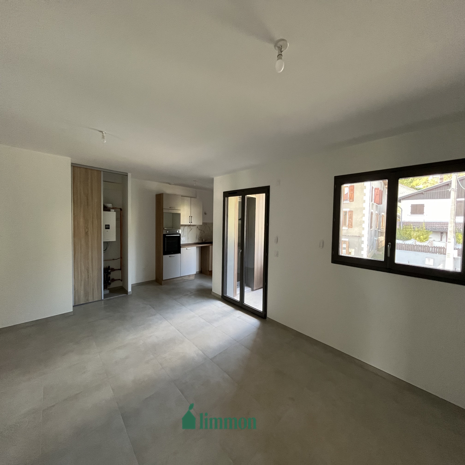 Le logement, aux tons modernes, ouvre sur un séjour de 39 m² avec cuisine équipée ouverte, donnant sur un balcon.